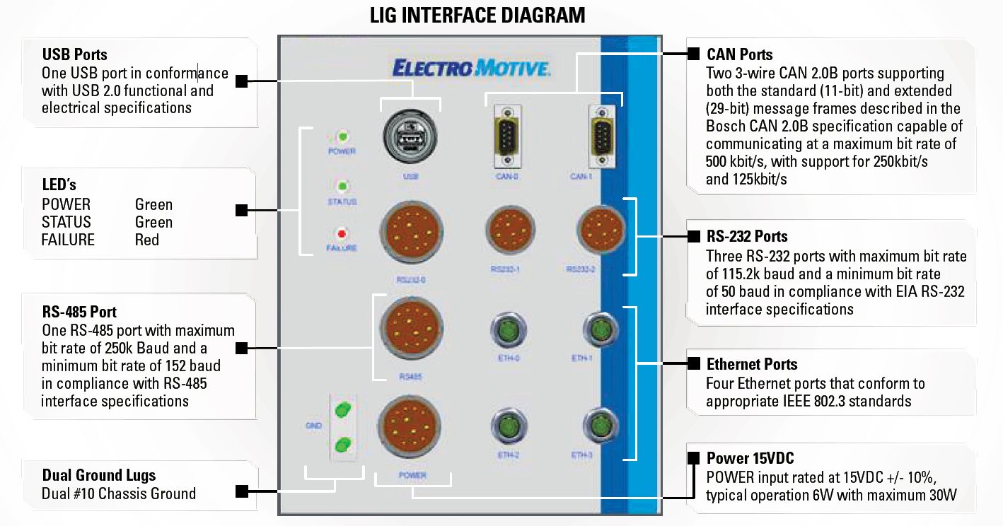 La passerelle d'interface locomotive (LIG) EMD® de Progress Rail est une solution innovante et intégrée qui utilise un contrôleur Cat® A5:N2 de pointe. Cette plateforme OEM sécurisée s'appuie sur plusieurs ports interfaçant avec les réseaux propriétaires EM2000, Functional Integrated Railroad Electronics (FIRE) et EMDEC®.