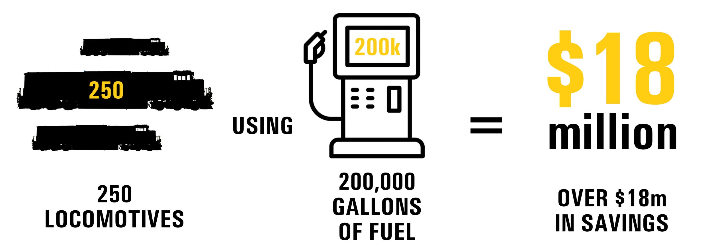 Dans cet exemple, un chemin de fer composé de 250 locomotives utilisant 200 000 gallons de carburant pourrait économiser plus de 18 millions de dollars en utilisant Talos.